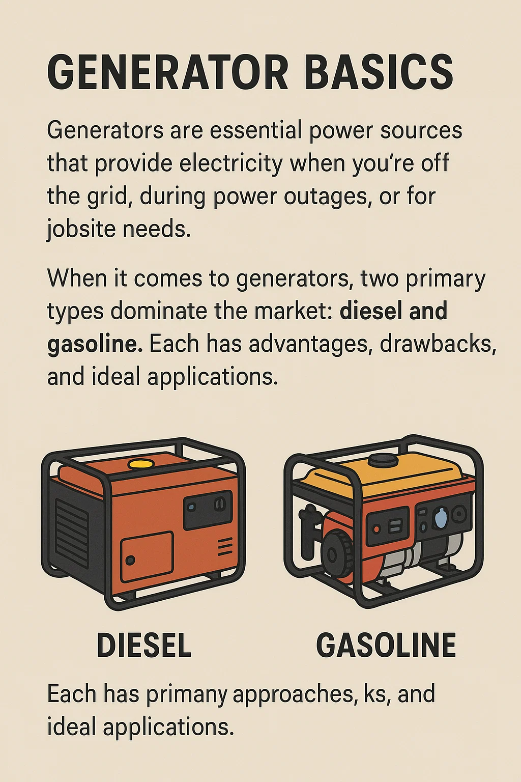 Khi nói đến máy phát điện, có hai loại chính chiếm lĩnh thị trường: dầu diesel và xăng . Mỗi loại đều có những ưu điểm, nhược điểm riêng và ứng dụng lý tưởng. Hiểu được những khác biệt này có thể giúp bạn đưa ra quyết định sáng suốt về việc cái nào phù hợp với nhu cầu năng lượng của bạn nhất.